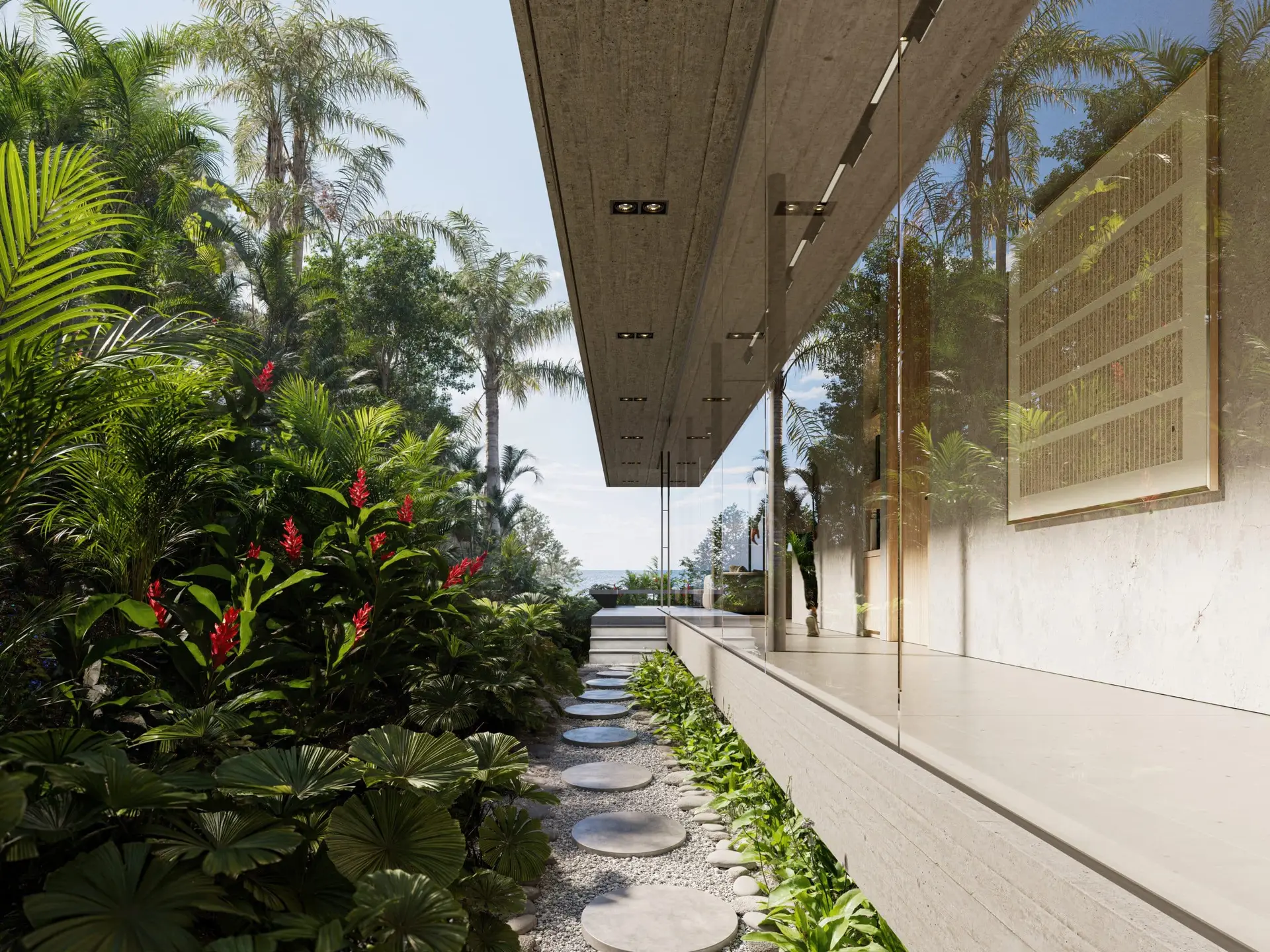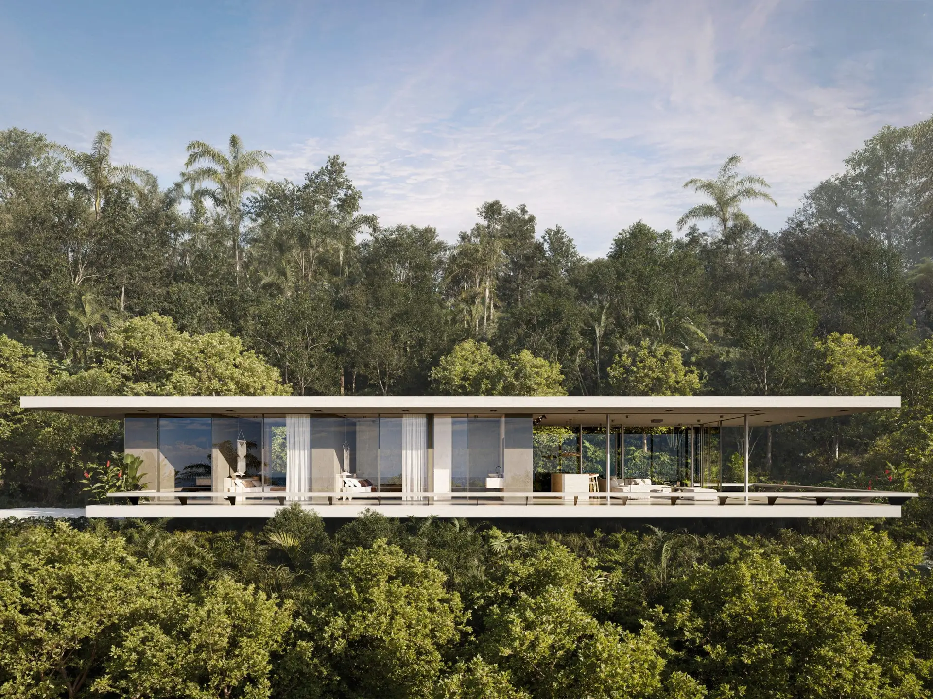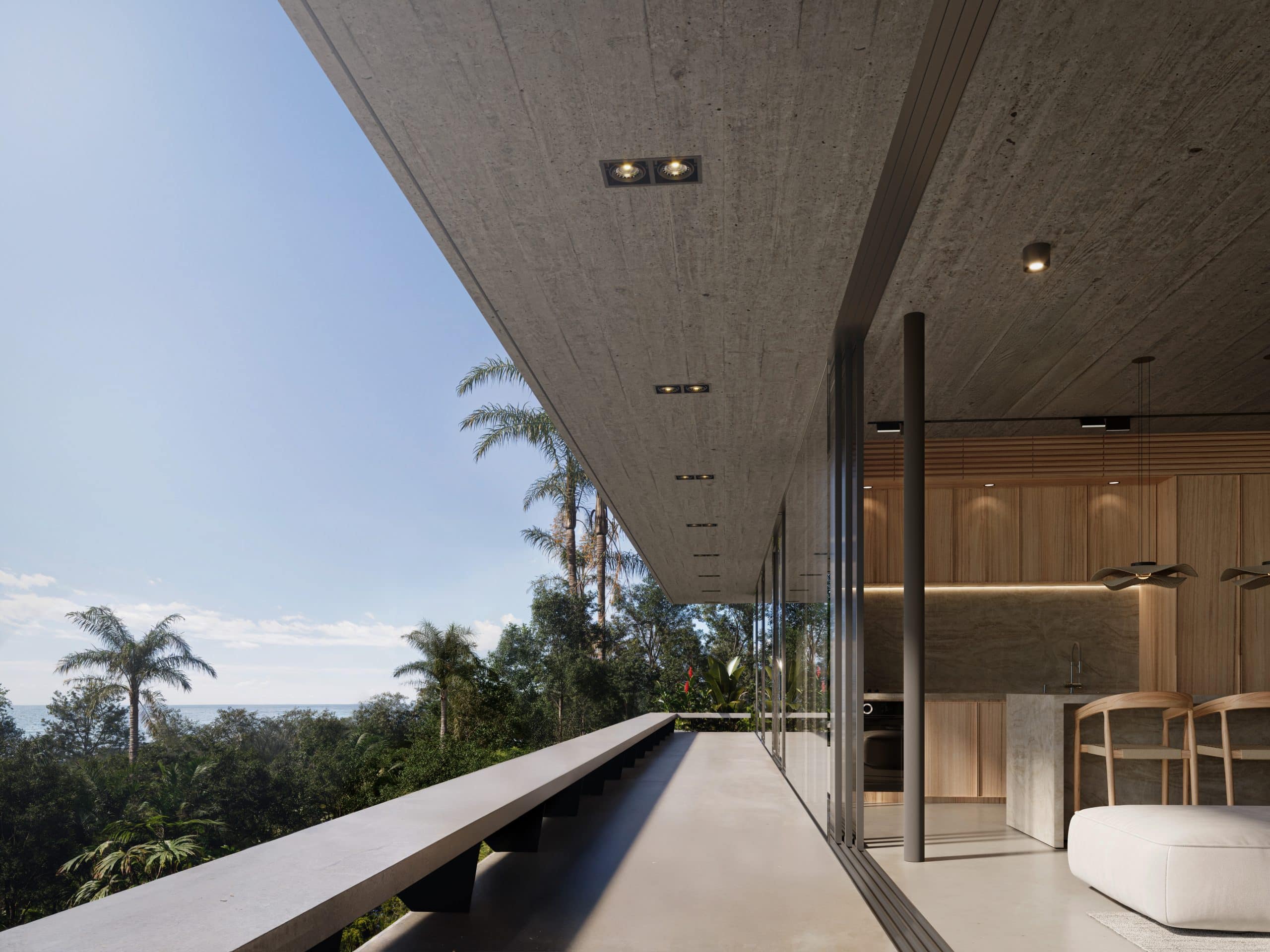Perched high above the Pacific, this residence is designed as a transparent pavilion that dissolves the boundaries between architecture and atmosphere. A massive, cantilevered concrete roof provides deep shade and protection, allowing the glass walls beneath to disappear entirely. By utilizing a raw palette of exposed concrete, warm timber, and local stone, the home feels like a natural extension of the mountain. a quiet, sophisticated platform for observing the changing light of the ocean.